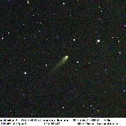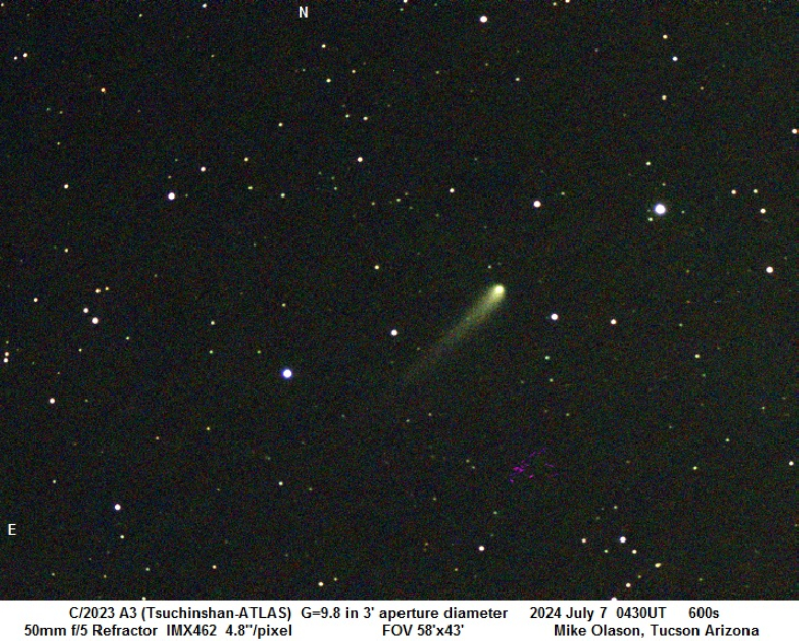 Comet C/2023 A3 (Tsuchinshan-ATLAS) was magnitude 9.8 on the evening of July 7 when it was 14 degrees above the western Tucson horizon. The comets coma and tail appear dusty with a creamy color.