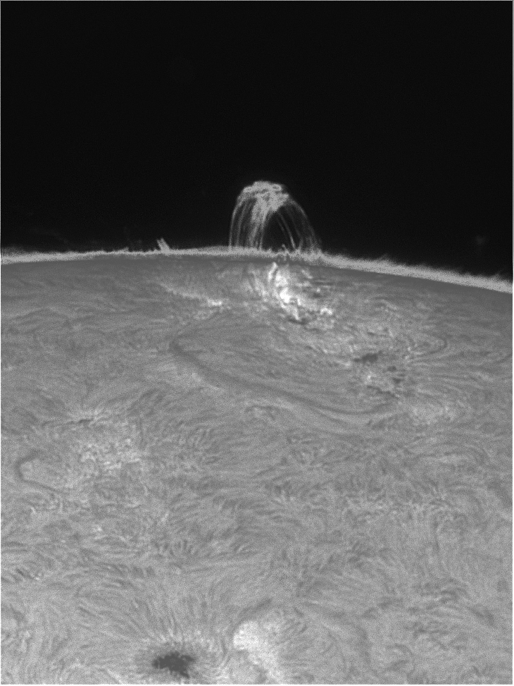 Big activity today! Apart from several large Active Regions, we had a splendid view of a tunnel shaped prominence close to AR3762 and AR3768. Material was constantly ejected and transported along field lines. I followed it during some 2 hours, under varying seeing. Here is just a snapshot. UTC 09.20. 115mm APO. Quark Chromosphere Ha filter. Baader ERF. ASI183MM.