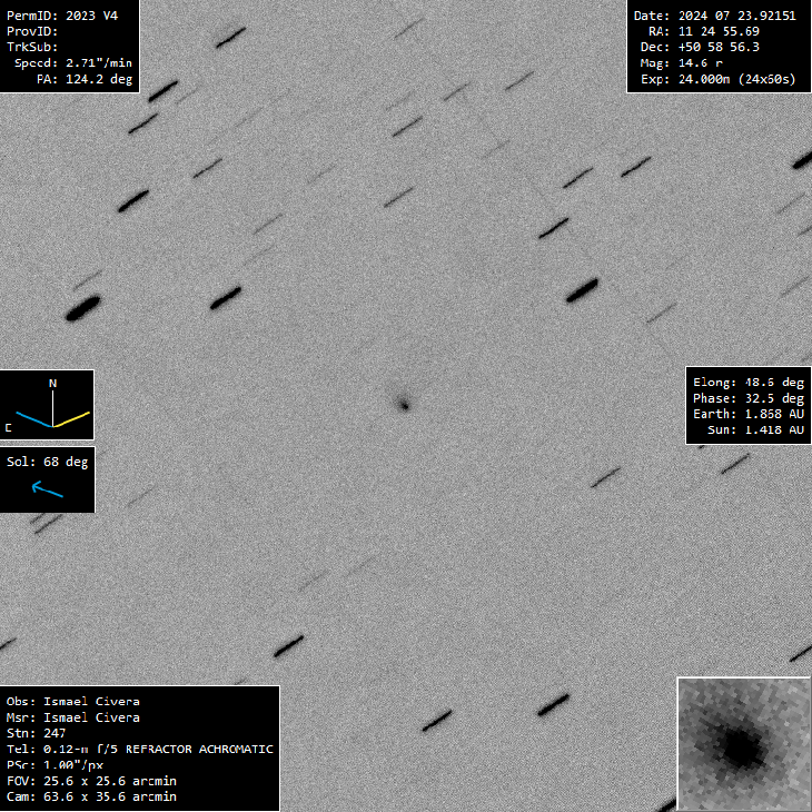 Comet 2023V4 (Camarasa-Duszanowicz)taken with a refractor 120 mm F5 achromatic and camera URANUS-C PRO. Software Tycho Tracker.More details inside picture