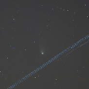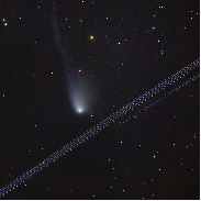 The starlink trail was incredibly bright when I first saw it a little to the right above the spot where comet OLbers was that evening.The luminous band slowly moved higher towards the east became fainter and finally disappeared into the Earth`s shadow.I was actually aiming for the comet Olbers.The fact that a bunch of Starlink satellites flew through 2°x3° fov.of my camera is not to be planned! Luck with goosebump effect :-) Picture details: 21:08-21:29h UT. 55x20 sec. FSQ 106 F/3.6 Eos RP Iso 3200. The second image is a single image. Except for the histogram unprocessed. Time of the picture: 23:14h MESZ. (21:14h UT.)