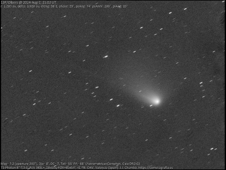13P/Olbers @ 2024-Aug-2, 21:02 UT r: 1.283 au, delta: 1.920 au, elong: 38°E, phase: 29°, psAng: 74° psAMV: 286°, plAng: 15° Mag= 7.2 [aperture 293"], Dia= 8', DC= 7, Tail= 55' PA= 68° (Astrometrica+Comphot, Gaia DR2-G) TS-Photon 8" f/3.6, Atik 383L+. 18x60s, FOV=85x64', left-E up-N. OAV, Valencia (Spain). J.J. Chambó