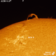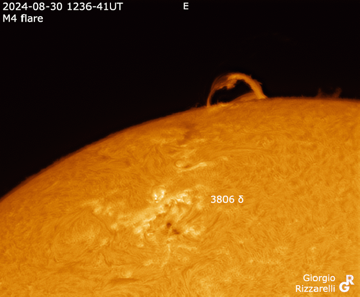 What a show! Yesterday Aug30 around 12/13UT an M3.8 flare occured in new delta AR3806, accompanied by the fast rise and fall of a big eruptive prominence from a region just behind East limb, probably connected to 3806. Also new gamma AR3807 flared in sympathy. The event began at 1215UT at C3 background. In just 5 minutes the M3.8 peak was reached. I was observing in visual and gasped when I saw not only a bright flare in 3806, but that flaring prominence. During the 20-min descent of the flare curve, the prominence lost luminosity but swelled and I got the first three gif (timelapses) (the no.1 is just a crop of no.3). The fourth timelapse covers about the subsequent hour, featuring an afterflare with a C6 plateau peak (again involving the three regions mentioned above); indeed this movie shows a secondary flaring eruption (rising, moving and falling). This phase is also the end of the main peak, and the movie shows the eruptive plasma falling back to the surface, guided inside the prominence's tube of magnetic flux.