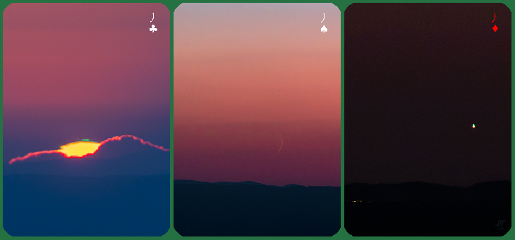 *cerro de la alcazaba de reina: - carta J ♣: espejismo superior en el orto solar, 07:58 / *sierra del viento, cerro de la capitana (965 m), guadalcanal: - carta J ♠: planeta y su satélite (y "pliegues" de calima en el planeta), 21:30, - carta J ♦: espejismo superior en el ocaso de venus, 21:52 / dslr, 400 mm, recortes