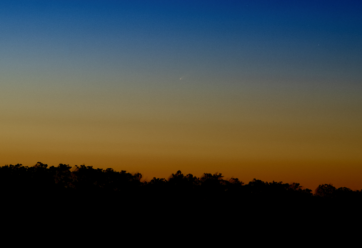 I was glad to finally recover it again after last imaging it several months ago. I could not see this at all with my unaided eye or binoculars due to the bright morning twilight. It's even hard to see in long-exposure photography as seen here. I had to do some stacking of these images to reveal the comet in the bright twilight.