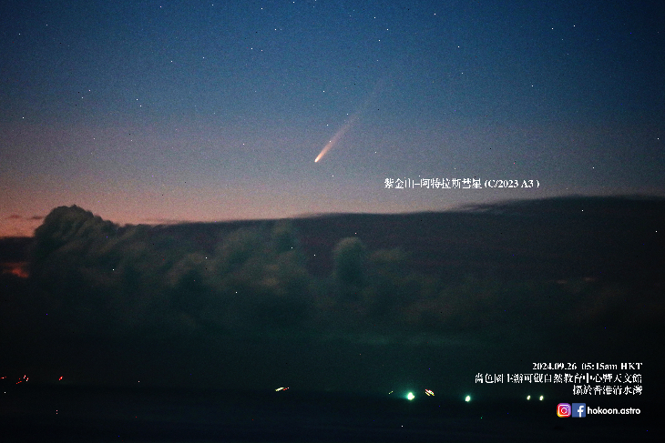 The Tsuchinshan-ATLAS Comet (C/2023 A3) appeared on the eastern horizon around 5 AM this morning. Seizing the brief opportunity before dawn, Ho Koon Astronomical Centre from Hong Kong headed Clear Water Bay to the east and captured a stunning image of the comet using a digital camera with a telephoto lens, exposing for about 10 seconds. It has been nearly 30 years since Hale-Bopp was last observed as a great comet in Hong Kong. We all look forward to see A3 to become a bright comet.