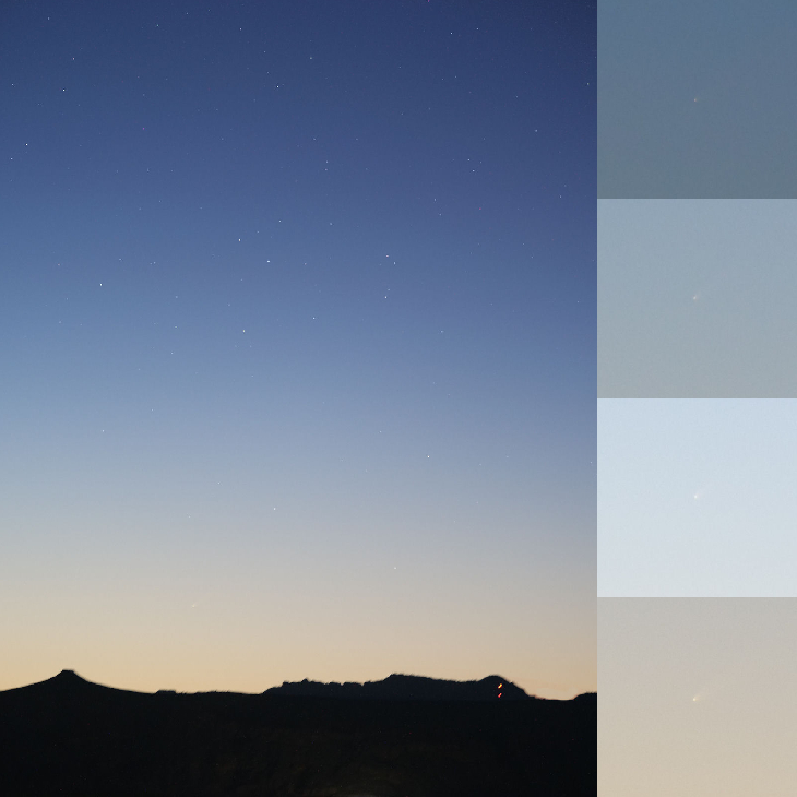 The main photo and the bottom inset photo are the same image. The main photo shows the entire FOV of a short telephoto zoom lens resized down to display on a tablet (hopefully the happy medium between the photo's full size and a smartphone's screen), while the insets are 400x400px crops from their original photos and shown at full size at 1:1 (i.e. the 400x400px area of an inset photo will occupy 400x400px on your screen). Also, the main photo's stars and the comet have been processed to be more prominent after resizing, while the insets are "straight out of the camera (SOOC)" with no processing (except for cropping).