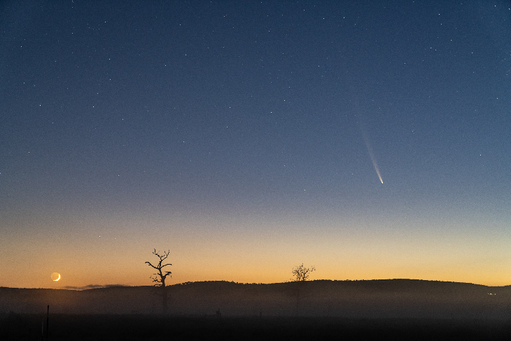 A single 6 second shot with the rising crescent moon and this comet is shining, easily visible to the naked eye before sunrise kicked in.