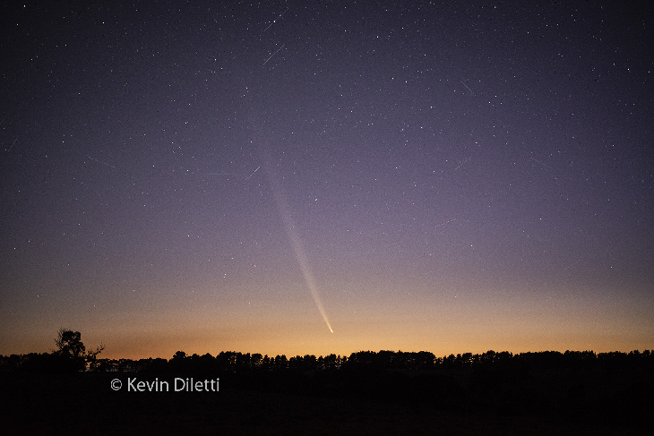 This photo of Comet 2023 A3 (Tsuchinshan-ATLAS) was taken from Triangle Flat in the Central West of New South Wales at 4:30 this morning (03 October 2024). It is a single 8-second exposure at f2.8 and ISO 3200 with the camera on a static tripod (no stacking, no tracking). The camera was an unmodified Nikon D800 with a trusty Micro-Nikkor 55 mm lens. Minimal manipulation was applied in Camera Raw – just a touch of Contrast and Clarity applied. The comet was barely visible to the naked eye in the pre-dawn light combined with the sky glow from the lights of Sydney 100+ km away. To the lower left of the comet are the lights of a plane approaching Sydney airport. The other 12+ streaks are successful attempts at polluting the night sky.