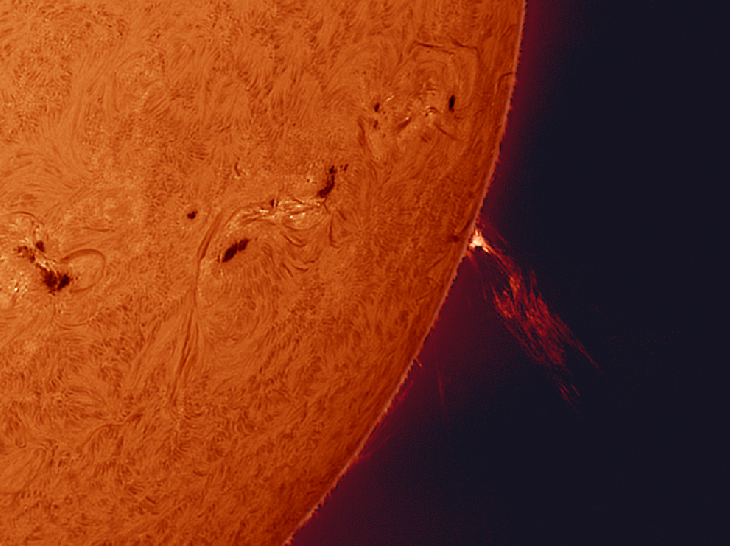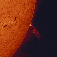 A string of active regions and a large prominence on the solar limb. Imaged with a Coronado 60 H-a filter, 102Vixen refractor and ZWO 174 camera.