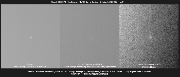 I've imaged Comet C/2023 A3 (Tsuchinshan-ATLAS) during daytime, after about 15 minutes of playing with the settings and processing the data on spot. Pretty hard to find it, in not too good conditions (some cirrus clouds rolling in). A comparison with Mercury using the same setup is shown. An elongated coma is detectable.