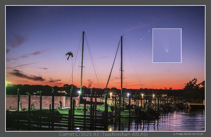 I imaged Comet C/2023 A3 (Tsuchinshan-ATLAS). My image was taken shortly after sunset with a Canon 70 - 200mm lens at 70 mm. The boats' green color is from a green light on the pole near them. As the night went on the sky got darker and the comet got more easier to see. I could see it in my camera viewfinder. Comet C/2023 A3 (Tsuchinshan-ATLAS) is a comet from the Oort cloud discovered by the Purple Mountain Observatory in China on 9 January 2023 and independently found by ATLAS South Africa on 22 February 2023. The comet passed perihelion at a distance of 0.39 AU on 27 September 2024, when it became visible to the naked eye. I was lucky to have had the opportunity to image this beautiful comet at its closest distance to Earth on 10-12-2024. I have more images to share that I use larger camera lenses. The largest was the Canon 300mm @.2.8 It is small in this image. Venus is also in the picture. At the time of this image, you could just start to see some of the come tail. Kind Regards To ALL 🙂