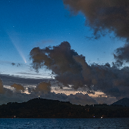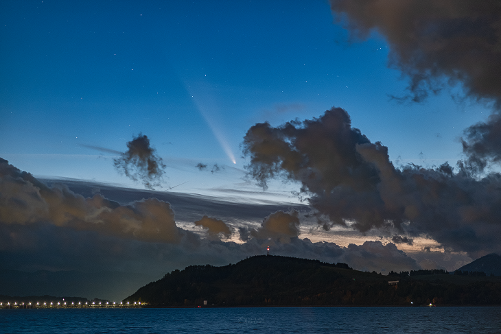 I cannot stop enjoying the comet C/2023 A3 Tsuchinshan-ATLAS every new evening when it appears brighter and bigger in the evening sky! This evening, I drove over 300 km to get a clear view of the comet, and such a spot I found on the shore of Slovakian lake Liptovska Mara. The clouds were thick and the moonlight stronger than yesterday, but the short moment when the comet appeared in the small window, was truly dramatic and unforgettable. I couldn't even believe how bright and long the tail was. What a view! Canon Ra, Samyang 85mm, f1.4, ISO 500, 1s (single shots), tripod.