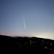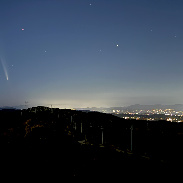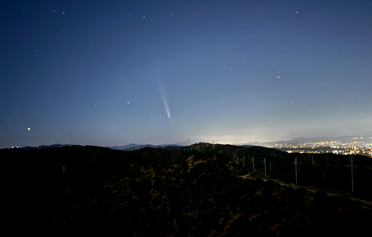 At 7:08 pm Teresa and I saw the comet faintly through a beautiful Los Angeles Sunset. We took our dog Stella to see the Comet from the abandoned Nike Missile Base off of dirt Mulholland Dr. overlooking the San Fernando Valley. The tail grew and grew and really is a naked eye event ( but does look REALLY nice with binoculars!) Can’t wait for tomorrow night! ISO 4000, 29mm, -0.1ev, f1.78, 10 sec exposure