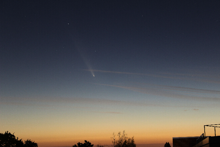 We saw the comet naked eye from the rooftop of the Science building at Whitman College about 45 min after sunset. Tail was easily visible -- quite the sight! Pictures taken with a Canon 600D and some basic editing in Canva.