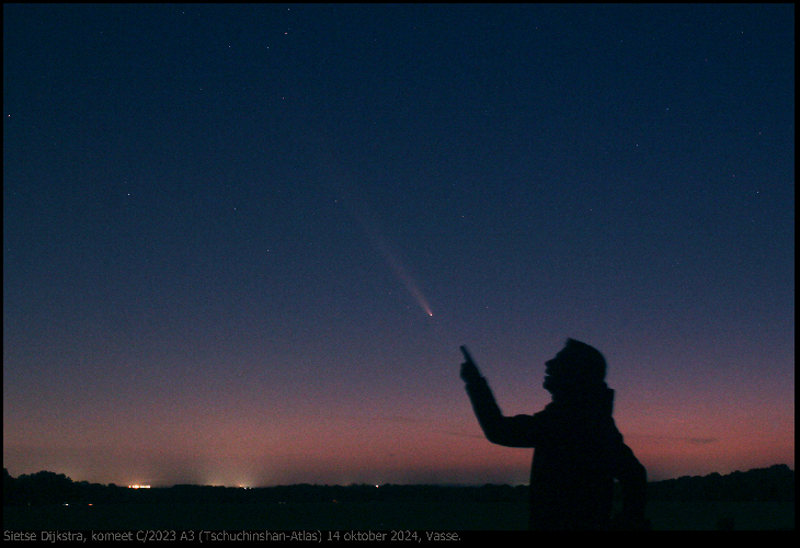 The first evening that the comet was reasonably to well visible from the Netherlands. It took a while before he was noticed after sunset. But once spotted, it is impossible to miss. This photo was taken from a somewhat higher spot near the village of Vasse in the east of the Netherlands. It is a single shot of 15 seconds on 35mm with a modified Canon EOS 60d. I edited the colors to what they actually were. In the foreground is a friend of mine. Amazed by this beautiful appearance!