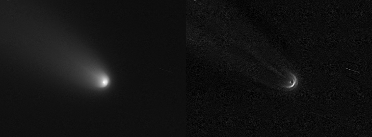 The nucleus of Tsuchinshan-ATLAS shows shells in the inner coma, a possible sign of rotation. Image from October 15, using a 115mm APO refractor, and ASI183MM camera. 350 frames of 1 second. Larson-Sekanina filter used for the right image.