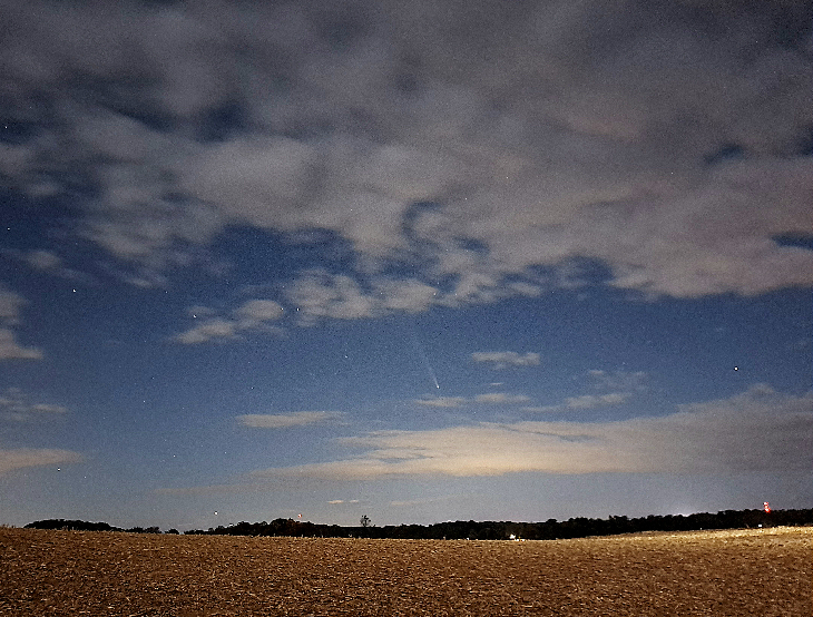 Comet faded a bit from night before, but still a magnificent sight. Clouds made for a relatively short observing window, but also provided interesting photographic juxtapositions. Samsung A53, ASA 640, 10-second exposure.
