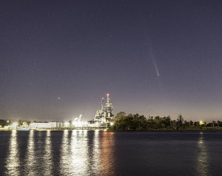 Comet Tsuchinshan-ATLAS and battleship USS North Carolina on the evening of October 14, 2024. Canon R, 35mm, ISO 800, 4 second exposure, 6 images.