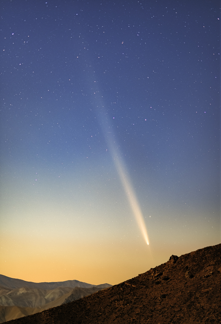 Captured under the enchanting glow of moonlight on October 15th, the stunning Tsuchinshan Atlas comet graced the night sky with its vibrant tail and intricate structures. At this time of October 20th and hereinafter, the window of darkness awaits before the moon rises, offering a perfect opportunity to witness this celestial beauty. Don't miss your chance to see this breathtaking spectacle! Details: Composite of 25 individual frames stacked with DSS and post process in PS. Each frame is 5 sec exposure at ISO400 Through Tokina Opera 50mm f1.5 FF lens on Fuji XT-2 body.