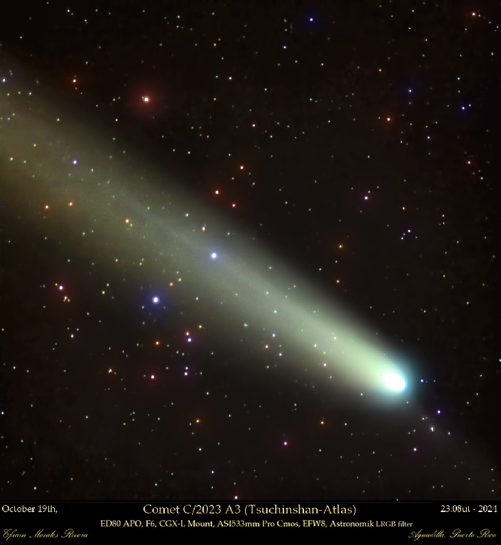 Comet C/2023 A3 (Tsuchinshan-ATLAS) on October 19th. Comet C/2023 A3 is in the constellation of Ophiucus, at a distance of 90,127,540.4 kilometers from Earth at a magnitude of 4. ( ED80 APO, CGX-L Mount, ASI533mm Pro Cmos, EFW8, Astronomik LRGB Filters.)