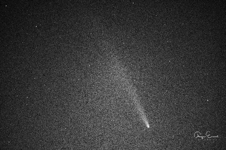 I processed this in black and white to see if I could see the anti-tail better. You can see that and what looks like a stream of light to the side of the comet. What do you think this is? More anti-tail to the side? Spaceweather, let me know your thoughts.