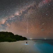 Here comes a shot I consider the most amazing moment with the comet C/2023 A3 Tsuchinshan-ATLAS. Watching from a small island Soneva Fushi of Maldives, I enjoyed this view two days ago (21 October 2024). The comet from equatorial locations shows its tail in almost an upright direction just to the northern summer part of the Milky Way. That evening, also the airglow was strong and some bioluminescence appeared in the Indian Ocean which made the photograph even more vivid. Hope you will like the view. Canon Ra, Sigma 50mm, f1.8, ISO5000, panorama of 58 single 8s exposures from tripod. Comet enhanced with 12x30s images (ISO1600, f1.6, tracked on Vixen Polarie U).