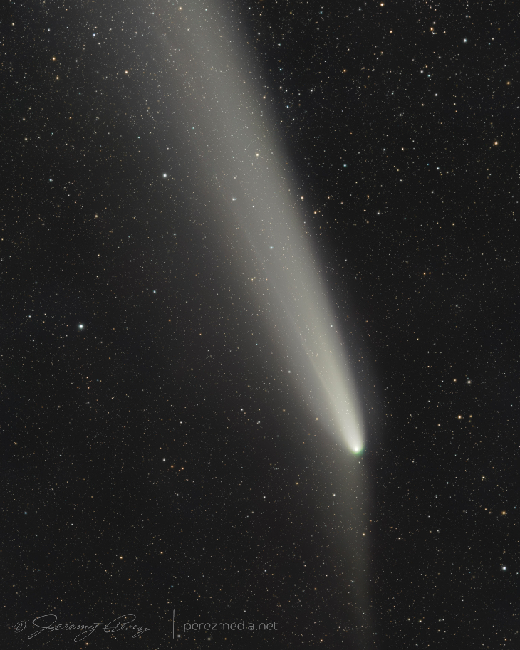There were definitely lots of fun shell games going on with the dust tail and a little cup of turquoise at the lead edge of the coma. The fanned out anti tail makes the whole left side of the frame a tad brighter.
