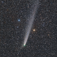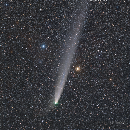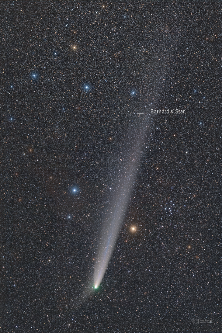Both are visibly moving in the sky, the comet and the star. The comet C/2023 A3 (Tsuchinshan–ATLAS) is now on its route further away from Earth and dimming. And still offers unique photo-opps for astrophotographers. One occured on 27 October 2024, when the comet's tail just projected in front of the radially fastest star in the sky and the closest single star to the Sun, Barnard's star. Located less than 6 light-years from Earth, it travels through the Galaxy with a speed of 90 km/s, and during a lifetime it changes its position with roughly half the angular diameter of the full Moon in the sky. And the comet? It moves a little bit slower, but also very quickly - every day several million kilometers from us. So two truly speedy celestial objects in one view! Taken on the platform of So Starstruck observatory, Soneva Fushi, Maldives, used Canon Ra, Tamron 70-200@200, f2.8, ISO5000, 79x20s, tracked on Vixen Polarie U, Optolong Clear Sky filter.