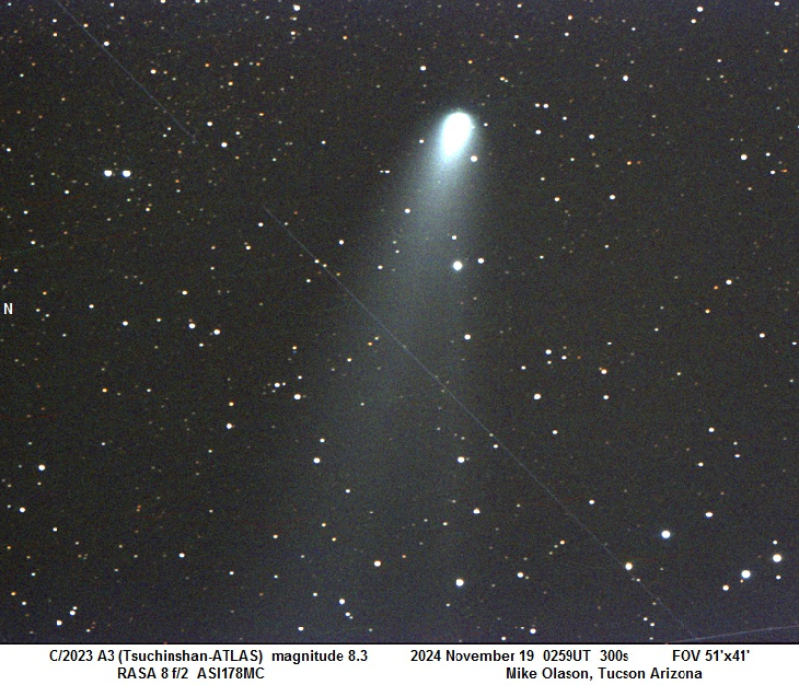 Comet C/2023 A3s rate of fading has slowed down the past 10 days, only fading 1/2 magnitude compared to the previous 10 days when it faded 1.1 magnitudes as observed from Earth. Magnitude 8.3 last evening. Still a nice tail and steady stream of debris but amazingly still no big clumps of material ejected at any one time, at least not that I have noticed.