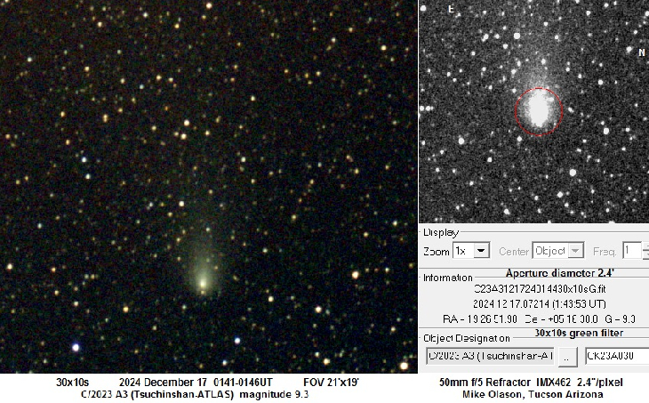 Comet C/2023 A3 on the evening of 2024 December 17 0144UT was magnitude 9.3, the tail is now noticeably shorter viewed from Earth as the comet is fading rather slowly now, maybe we are observing more of the comet coma and tail complex overlapping as seen from Earth.