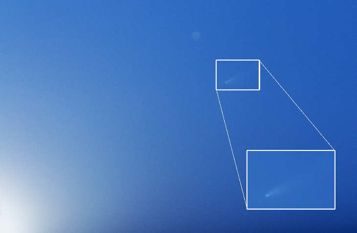 The comet C/2024 G3 ATLAS photographed in broad daylight on January 12, 2025, at 1:30 PM Italian time (12:30 UTC). The comet C/2024 G3 ATLAS, belonging to the sungrazer category (comets that graze the Sun), will reach its perihelion on January 13, 2025, passing just 3,916,597 km from the Sun—less than one-tenth the distance between Earth and our star. This close approach has made it extremely bright, with a magnitude similar to that of the planet Venus. However, it is also immersed in the intense glare of sunlight, making it difficult to observe. The photograph, made possible thanks to a clear day and excellent atmospheric transparency, is the result of a complex daytime imaging technique. To capture the image, the Sun was carefully obscured behind a building, and 165 frames of 1/1000 second each were taken, later averaged through digital processing. Important note: The comet was not visible to the naked eye nor in individual frames. It was revealed through extreme processing of the stacked images. This type of capture can also be dangerous and should only be attempted by experienced observers. It is essential to protect both the camera sensor and the observer's eyesight with appropriate solar filters during the set up phase.