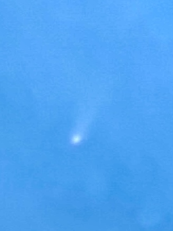 At 3:54 PM MST, I went out with my telescope and aligned to the sun using a solar filter. I then input the comets coordinates and had the telescope go to it. As soon as I verified the sun was out of the field of view, I took off the solar filter. To my surprise, I could see the comet and a little bit of its tail. One 20 second exposure with my iPhone yielded this photo after adjusting the exposure on the photo app.