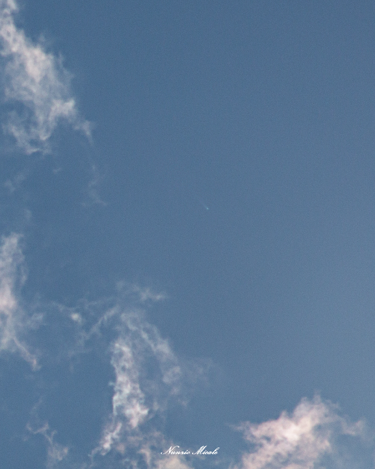 Between one hope and another of spotting it among the clouds, I managed to capture comet C/2024 G3 (Atlas) the day after its perihelion, at 12:45 PM, when it was only 6° away from the Sun. With a magnitude of about -2.0, it wasn’t immediately visible in the shots when viewed on the camera display. Once at home, I increased the contrast and sharpness, finding it in several shots within the Sun's diffused light. I then performed stacking on Siril and processed everything in Photoshop. Canon EOS 70D, ISO 100, f/14, 1/800 sec exposure, 190 mm focal length.