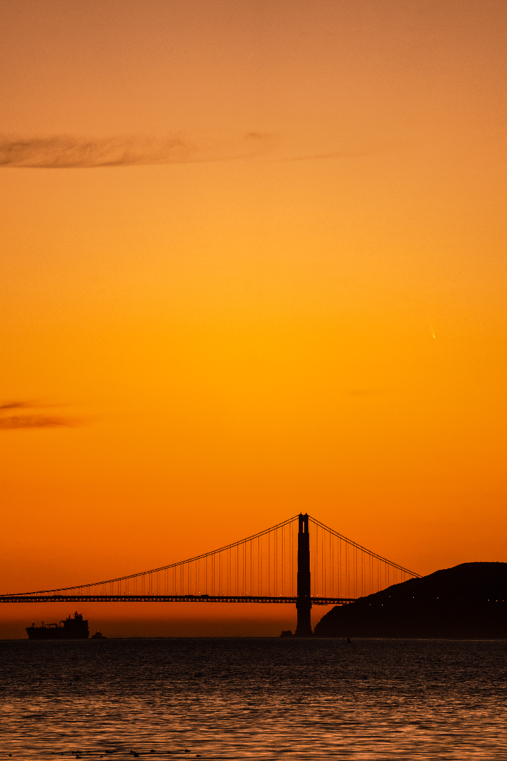 C/2024 G3 ATLAS above Golden Gate Bridge. Easily visible in 10x50 binoculars starting 2 min after sunset, yet not easily visible to naked eyes.