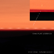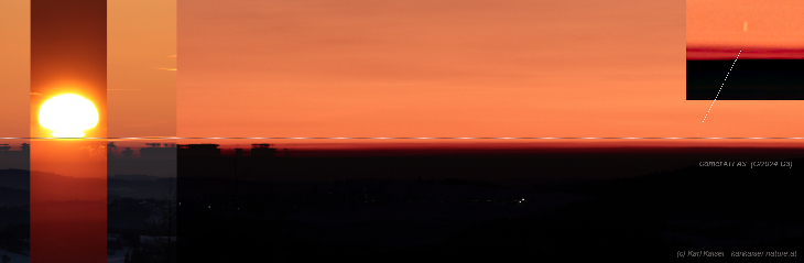 On January 14, 2025, I was able to photograph Comet ATLAS (C/2024 G3) just after sunset in best atmospheric conditions. (https://spaceweathergallery2.com/indiv_upload.php?upload_id=219384). There was a well-developed inversion layer over the foothills of the Alps, which produced an overwhelming sunset and led to a magnificent mirage of the Alps. The big surprise emerged when I viewed the images in the evening: The head of Comet ATLAS was significantly increased in brightness and elongated by the mirage before it sank! The mirage occurred at the same altitude at which the first large segment split off from the sun! The comet insert is a 100% detail of a single frame. The included solar image was taken at 15:34 UT.
