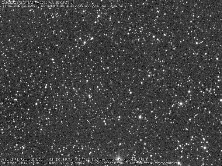 2025 Feb. 16.80 UT: m1=15.5, Dia.=0.3’, DC=2/, Tail=0.6' in p.a. 246°; 0.2-m f/3.7 Reflector + CCD; J. Chambó (Vallés, Valencia, Spain) [Exp=11x60sec, FOV=38x29'(crop), left=E up=N, Astrometrica+Comphot, Gaia DR2-G]