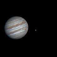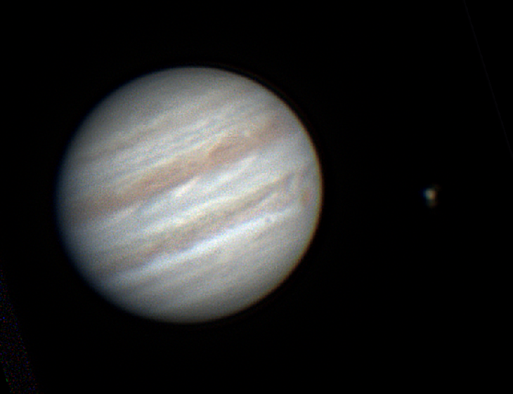 Jupiter with two moons visible. Ganymede on the right and Europa at the very edge of the right side of the disc.