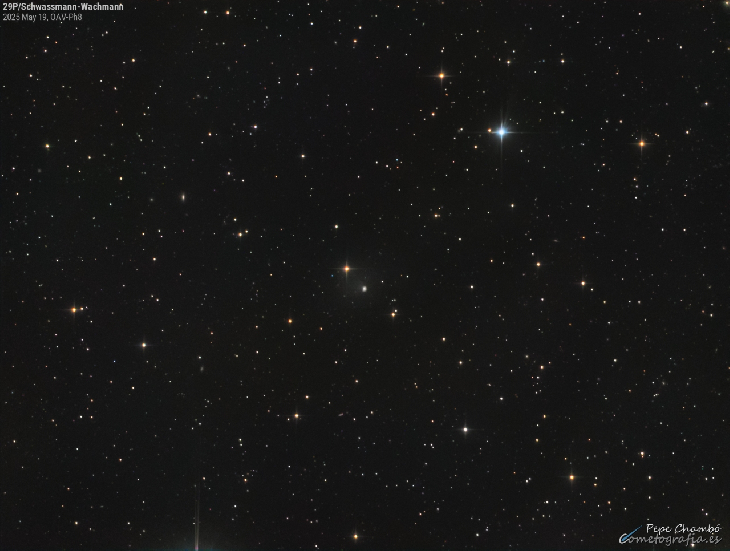 On May 19, 2025, one week after an outburst from comet 29P/Schwassmann-Wachmann, I captured this image showing a new expanding cloud emerging from its nucleus. The cloud is highly condensed, asymmetrical in shape, and surrounded by the gaseous envelope from previous outbursts, which spans 7 arcminutes and appears very diffuse and faint. The entire structure has a total brightness of magnitude 11.6, set against a field filled with small galaxies in the constellation Leo.