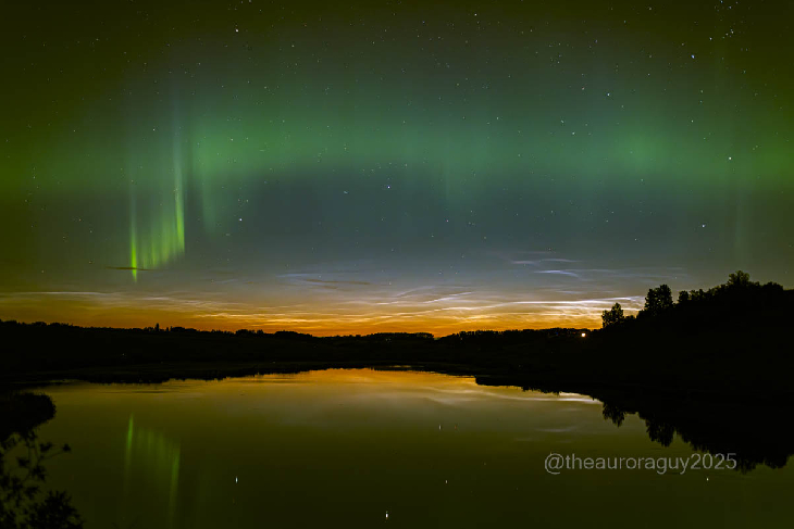 The aurora borealis and the noctilucent clouds overcame the waxing gibbous Moon and Northern wildfire smoke to put on a magnificent display.