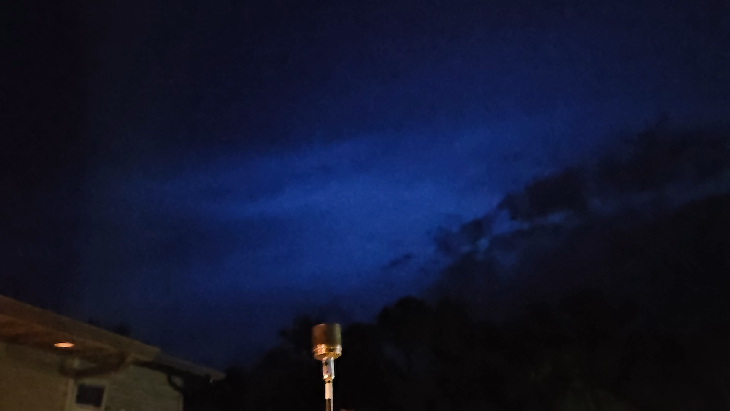 I saw a blue glow to the north of of my bedroom window and went to investigate. It was a bright glowing blue. You can see the regular clouds and trees in front of it. It was well after sunset, about 10:15p.m. central time.