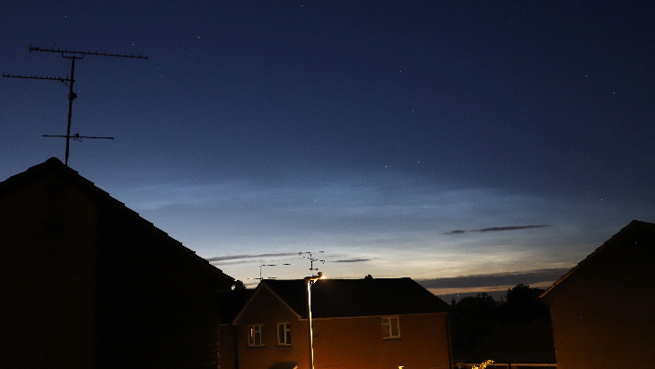 A nice bright evening display of Noctilucent cloud, the first of the season for me at 51.42 degrees North in southern England, UK. This photo taken 23 June 2025 at 23.04 BST (22.04 UTC).