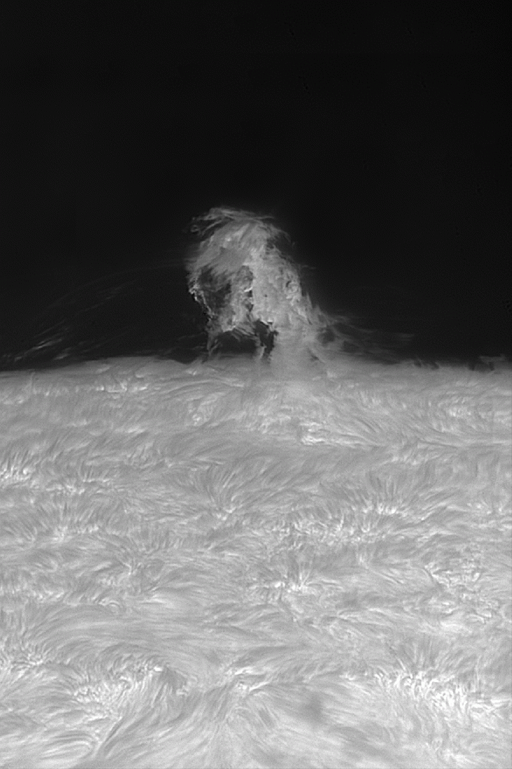 I have now examined the beautiful eruptive prominence of June 23rd in more detail and created a more fluid animation. I noticed an apral effect of some falling drops in the prominence. When I saw the animation, I immediately remembered the message on Spaceweather (on June 11, 2024), in which Big Bear showed an animation in pink color, which had a similar effect. The gas in the corona only flowed up to an invisible wall, accumulated there and faded. During my observation, some structures bounced off this invisible wall and were thrown back up again. Exactly at 06:33:06UT . Perhaps this is the same effect that the professionals had described
