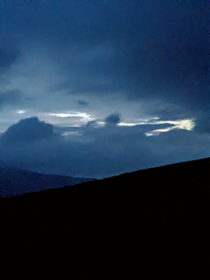 Some Noctilucent Clouds just after midnight through gaps in the heavy Tropospheric clouds.
