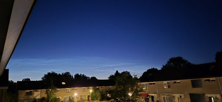 Bright noctilucent clouds seen in the heavily light polluted sky of the Noordoostpolder. Photographed at 21.51 UT with a Samsung S24. F1,8 23mm iso 3200, 1,9 sec.