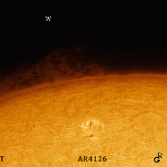 After the big show of prominences of the recent days, today, with Sun rotation, another long N-S filament arrived on West (right) border, displaying a notable prominence, this time hedge-like. The second pic features this prominence; it also includes Active Region 4126, responsible of a C4 flare of two days ago with Earth-directed CME, which may trigger a G1 geomag storm tonight. Lunt60 H-alpha + Neptune-M. SharpCap, AS!, Registax, PS. Red chromosphere artificially colorized in yellow. The detailed pic is the product of two shots with different exposures.