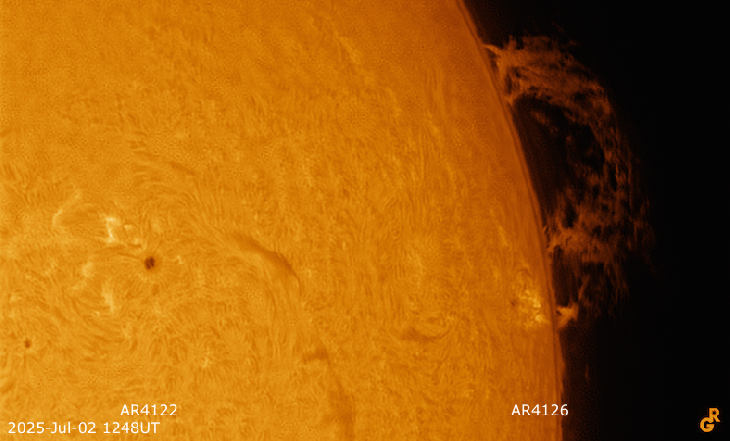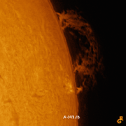 Today the fila-prominence seen yesterday rotated to become a spectacular arch. It's close to AR4126, which 3 days ago produced the CME that is expected to arrive today triggering a G1 geomag storm. Lunt60 H-alpha, Neptune-M. SharpCap (2 movies with different exposures for prominence and surface), AS!, ImPPG, Registax, PS. Red chromosphere colorized in yellow.