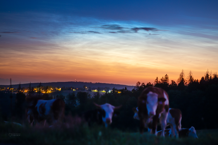 This morning, truly bright NLCs appeared over Proseč u Seče, Czech Republic, central Europe. The clouds were so bright that I could even see my shadow, and the central part was overexposed. The colors were easily visible to the naked eyes, including the red tint at the upper edge of the clouds. What a display! Used Canon Ra, Samyang 85mm, f1.4, ISO 400.