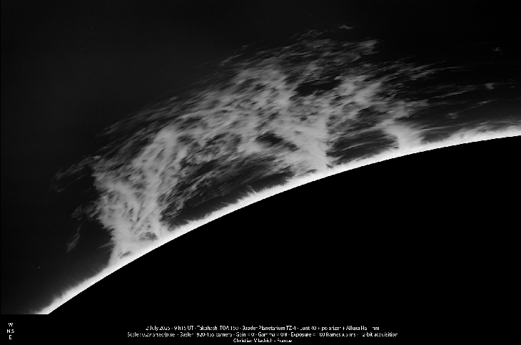 Takahashi TOA 150 - Lunt 40 Ha filter Two-hour animation visible at: https://viladrich.astrosurf.com/astro/soleil/wl/2025/2025-07-02-ChrVldr-TOA150-Ha.avi