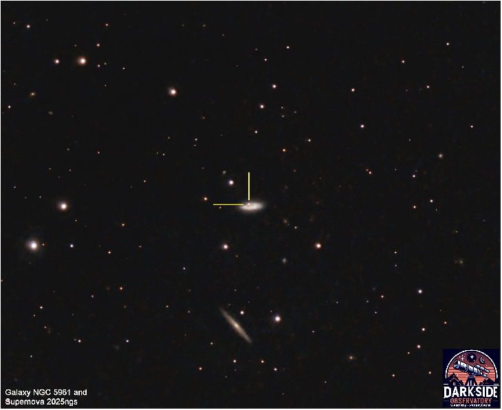 This is the galaxy designated NGC 5961 located in the constellation Corona Borealis. Inside the galaxy is the supernova 2025ngs that I imaged on July 4, 2025. My magnitude estimate based on 60 minutes of collected data is V16.1. Tech Specs: Meade 12” LX-90 SCT Telescope, Antares Focal Reducer, ZWO ASI2600MC camera running at 0F, 60 x 60 seconds, Celestron CGX-L pier mounted, ZWO EAF and ASIAir Pro, processed in Tycho Tracker and PixInsight. Image Date: July 4, 2025. Location: The Dark Side Observatory (W59), Weatherly, PA, USA (Bortle Class 4).