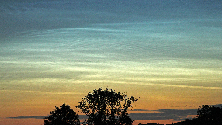 Blue and yellow noctilucent clouds. An example of the different colours of noctilucent clouds a display can exhibit (yellowish close to the horizon and light blue just a little higher up), from the display on 2-3 July 2025.